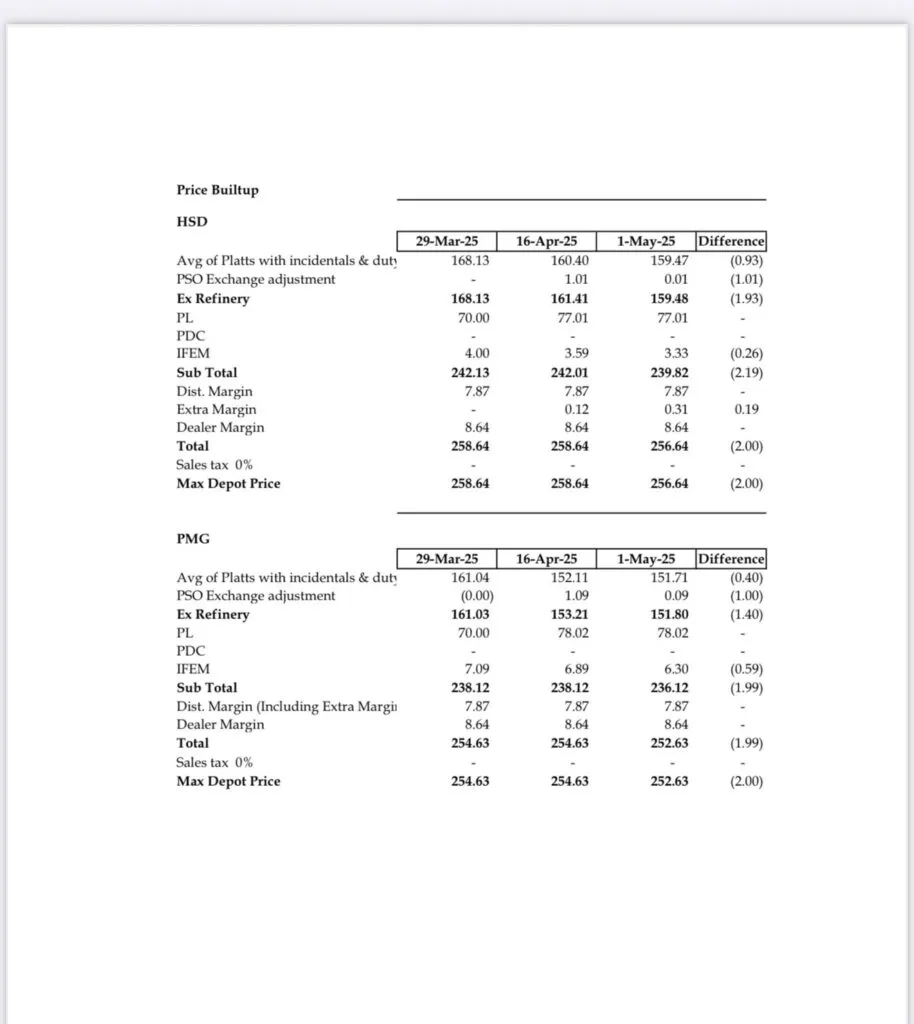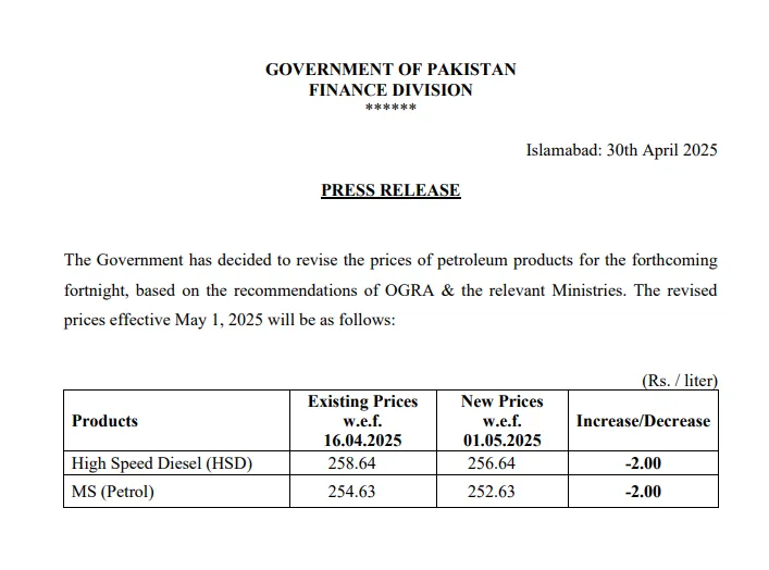 ISLAMABAD: The government has reduced the price of petrol and diesel by Rs 2 per liter each, effective from May 1, 2025.