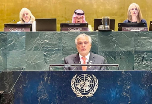 سعودی عرب اور فرانس کی مشترکہ میزبانی میں منعقدہ اس کانفرنس سے خطاب کرتے ہوئے اسحاق ڈار نے فرانسیسی حکومت کی جانب سے فلسطینی ریاست کو تسلیم کرنے کے فیصلے کو سراہا اور کہا کہ عالمی برادری کو اب فلسطینی عوام کے حقِ خود ارادیت کو تسلیم کرنا ہوگا۔