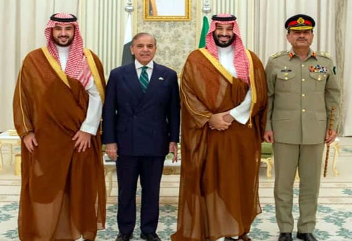 ولی عہد شہزادہ محمد بن سلمان کی دعوت پر وزیراعظم شہباز شریف مملکت سعودی عرب کے سرکاری دورے پر اسلام آباد سے ریاض پہنچے جہاں سعودی F-15 لڑاکا طیاروں نے وزیراعظم کا شاندار استقبال کیا، دونوں رہنماؤں نے دفاعی معاہدے پر دستخط کردیے جس کا مقصد پاکستان اور سعودی عرب کی خودمختاری و سالمیت میں ایک دوسرے کا ساتھ دینا ہے۔