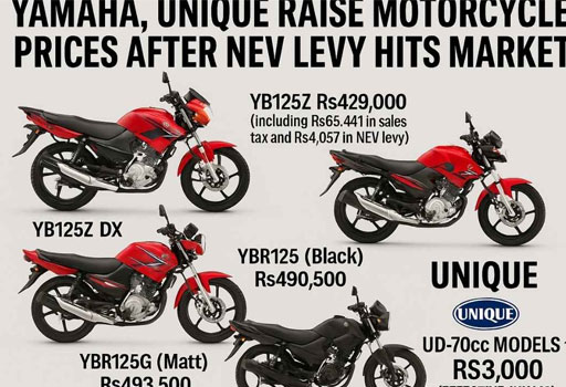 دوسری جانب، ڈی ایس موٹرز پرائیویٹ لمیٹڈ کے برانڈ “یونیک” نے بھی اپنی UD-70cc موٹر سائیکل کے تمام ماڈلز کی قیمتوں میں 3,000 روپے کا اضافہ کر دیا ہے، جو 18 جولائی 2025 سے نافذ العمل ہوگا۔
